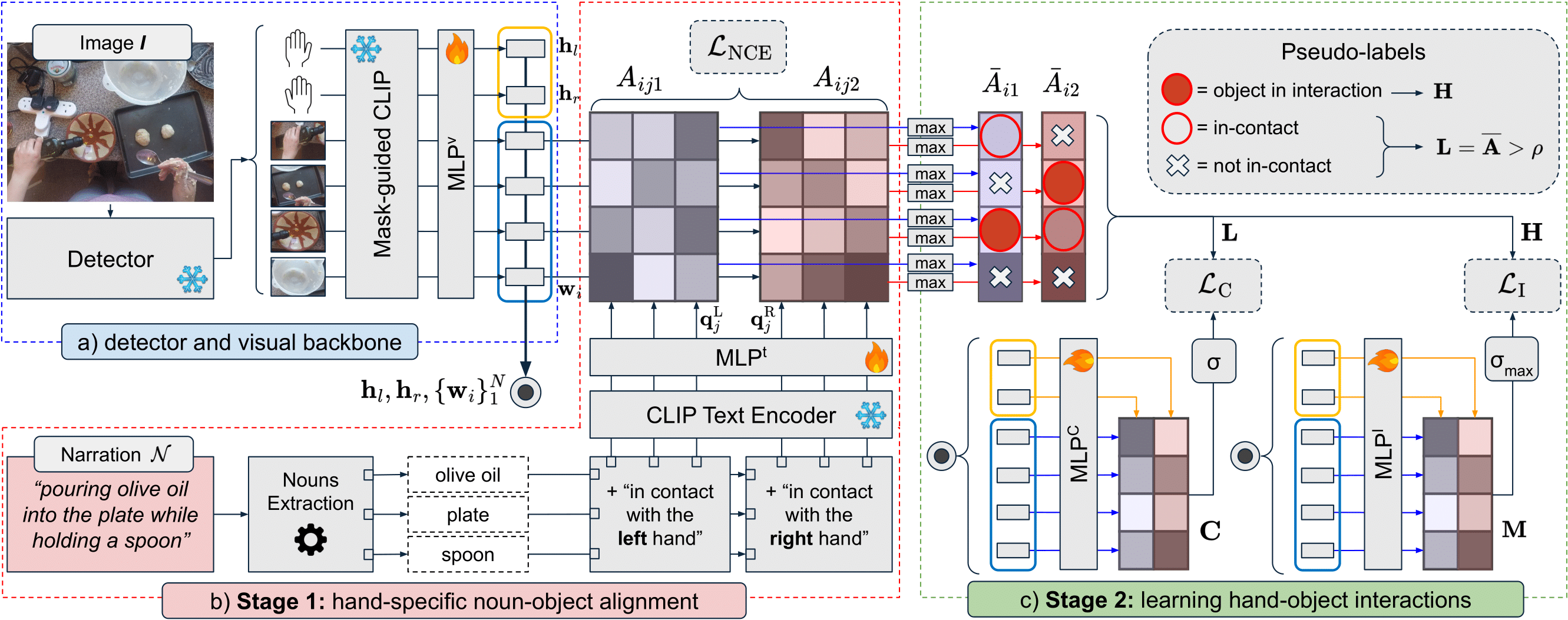 The Architecture of WISH: Our model operates in two stages sharing a common backbone. (a) An object segmenter and a CLIP-based backbone extract visual embeddings for all object and hand proposals. (b) In Stage 1, we learn a shared embedding space to align hand-specific noun phrases from narrations with their corresponding visual object embeddings. (c) In Stage 2, we generate pseudo-labels from this alignment to train two specialized heads: a Contactness head (C) and a Matching head (M). At test time, only the backbone and Stage 2 are used for narration-free in-hand object segmentation.