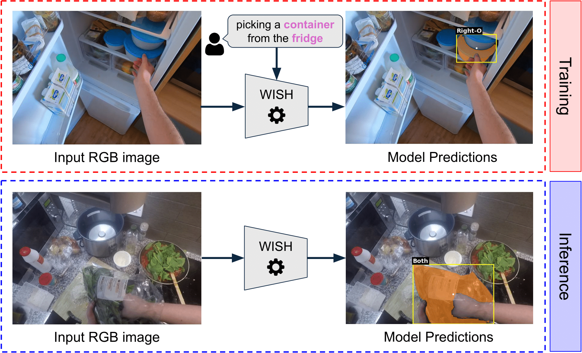 We benchmark WISH against different baselines based on open-vocabulary object detectors and vision-language models, showing the superiority of its design. Experiments on EPIC-Kitchens and Ego4D show that WISH surpasses all baselines, recovering more than 50% of the performance of fully supervised methods, without employing fine-grained pixel-wise annotations.